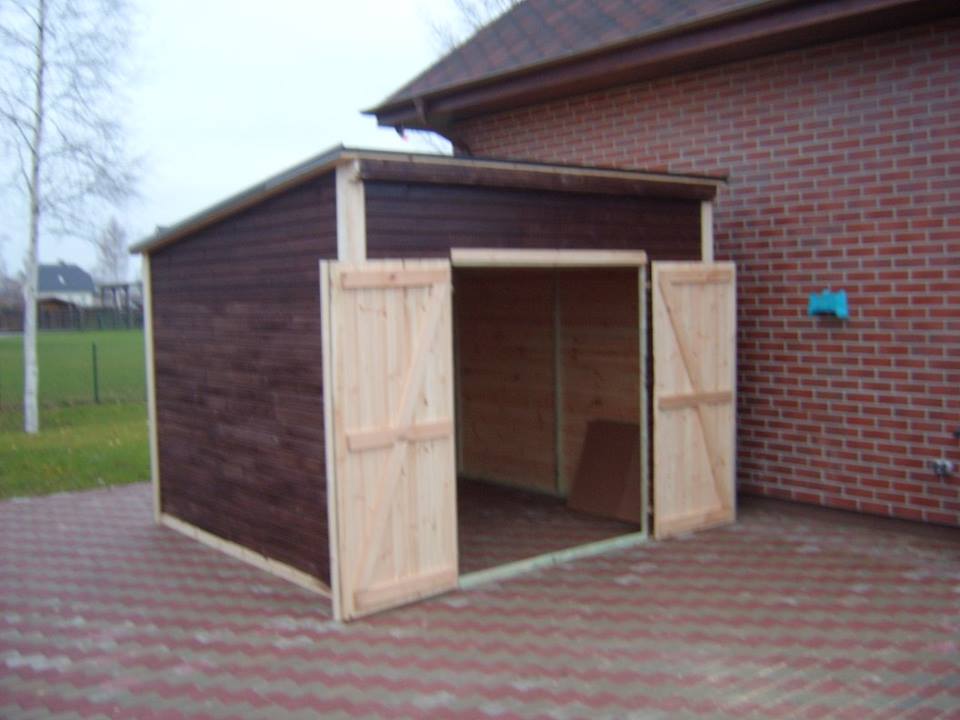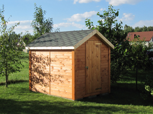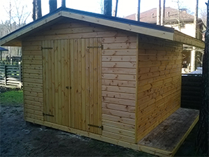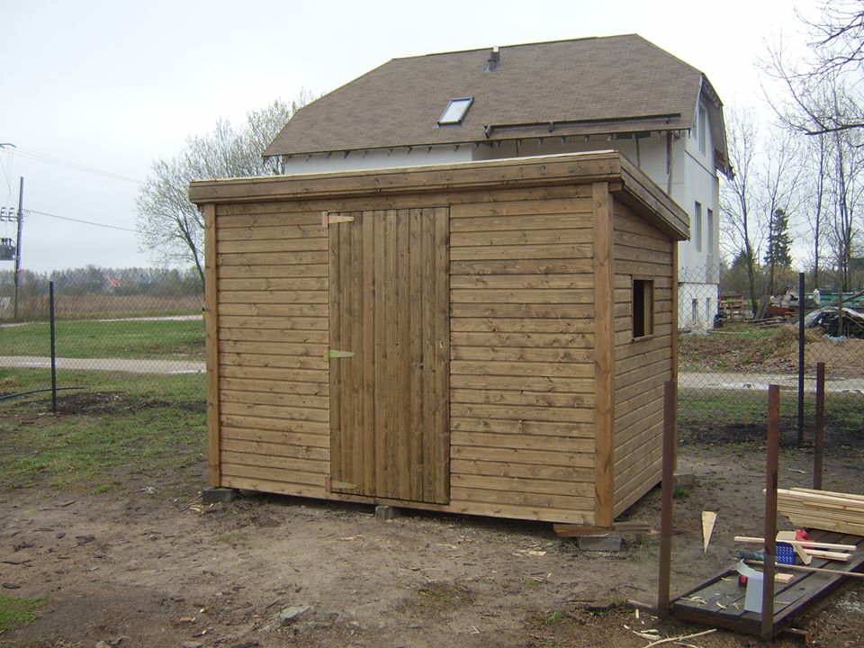 Ēkas karkass gatavots no 50x50mm un 50x100mm priedes brusām. Apšūts ar 19x95mm priedes spundētiem dēļiem. Jumta segums – bitumena šindeļi. Jumtam iespējams jebkurš cits seguma materiāls. Piemērots kā garāža mini traktoram, motoblokam, motociklam u.c.