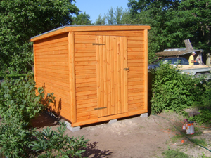 Ēkas karkass gatavots no 50x50mm un 50x100mm priedes brusām. Apšūts ar 19mm bieziem spundētiem dēļiem. Jumta segums – bitumena šindeļi. Jumtam iespējams jebkurš cits seguma materiāls.