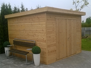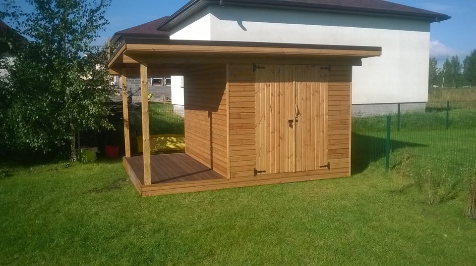 Terase 1500mm plata. Ēkas karkass gatavots no 50x100mm un 50x100mm priedes brusām. Apšūts ar 19mm bieziem spundētiem dēļiem. Skārda jumta segums. Jumtam iespējams jebkurš cits seguma materiāls.