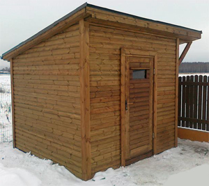 Ēkas karkass gatavots no 40x100mm priedes brusām. Apšūts ar 19mm bieziem spundētiem dēļiem. Jumta segums – bitumena šindeļi. Jumtam iespējams jebkurš cits seguma materiāls.